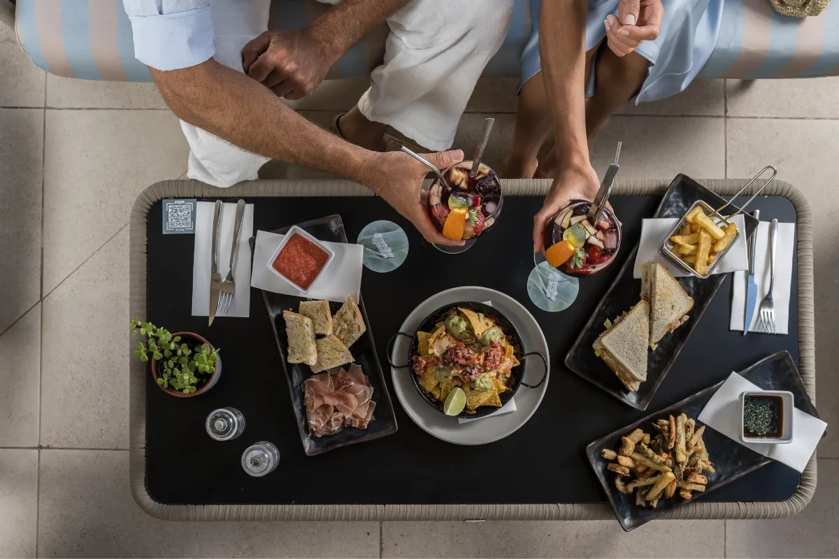 Platos variados con nachos, bocadillos y bebida sobre una mesa negra.