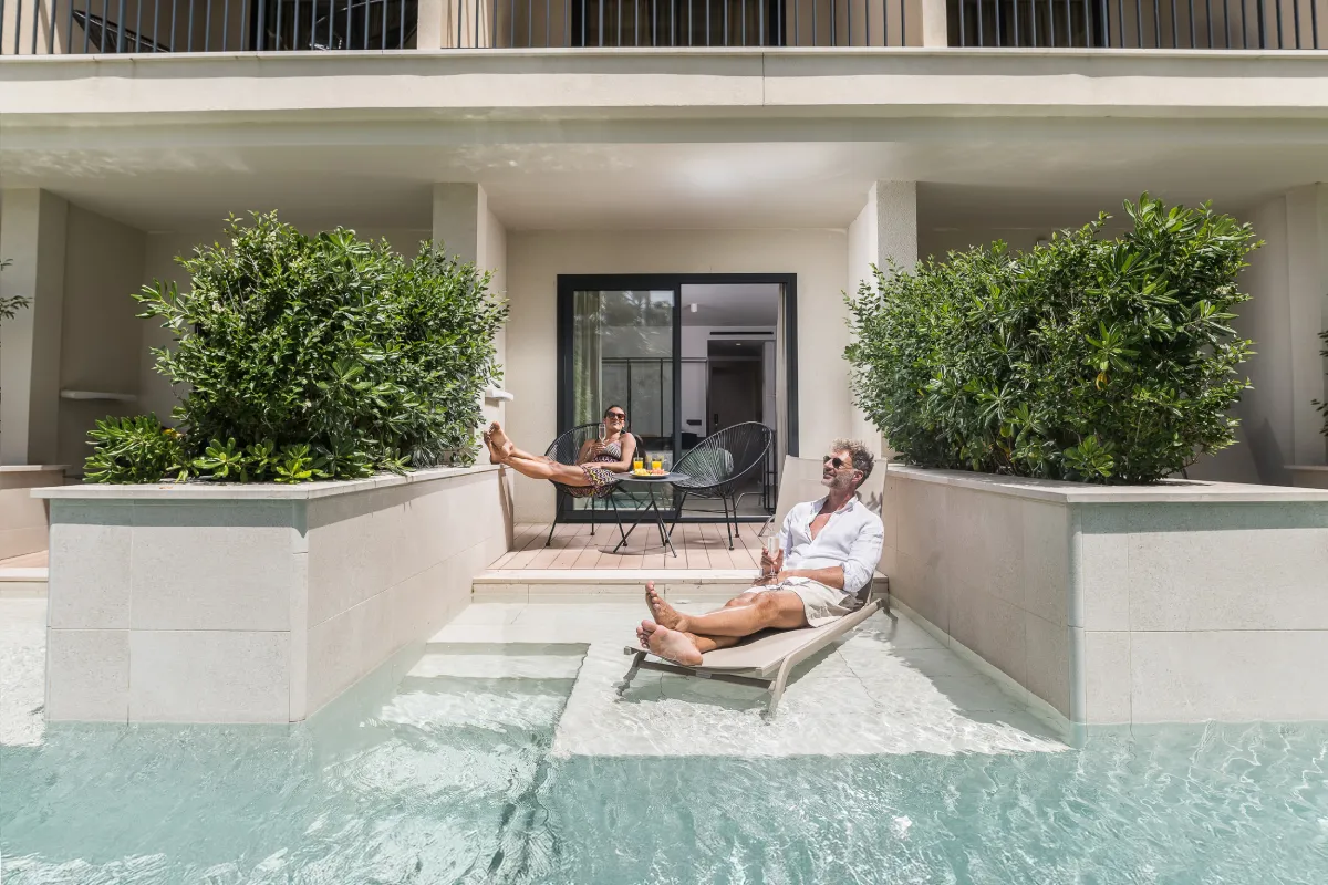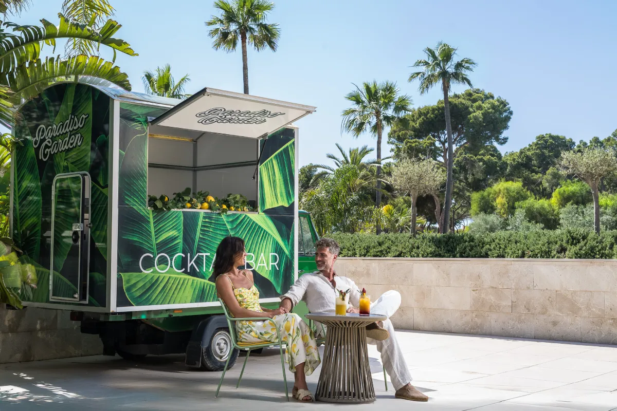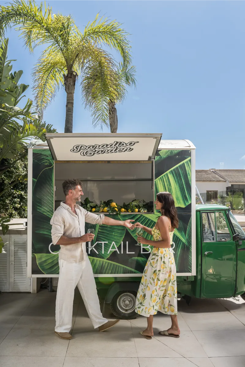 Pareja sonríe y brinda con cócteles en frente de un cartel que dice "Paradiso Garden".
