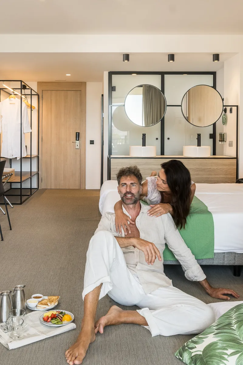 Pareja en habitación moderna; mujer en verde abrochándose el calzado, hombre sonríe con botella.
