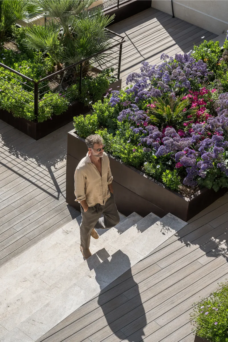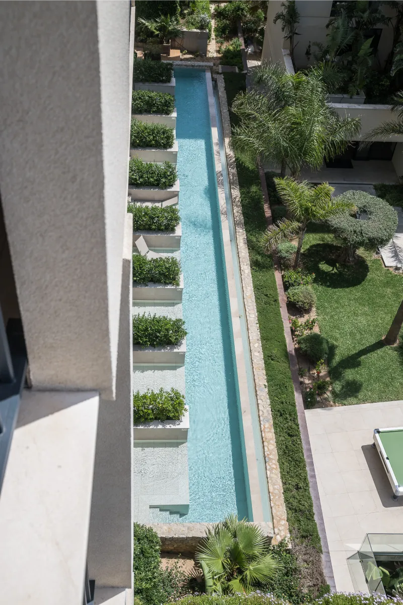 Piscina larga rodeada de jardines y plantas desde una vista aérea.