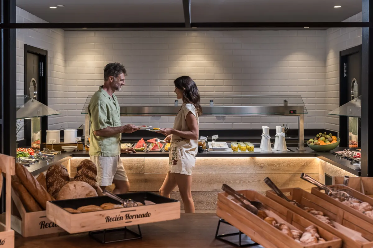 Recepcionista mostrando un menú a una pareja en un spa, rodeados de velas y plantas.