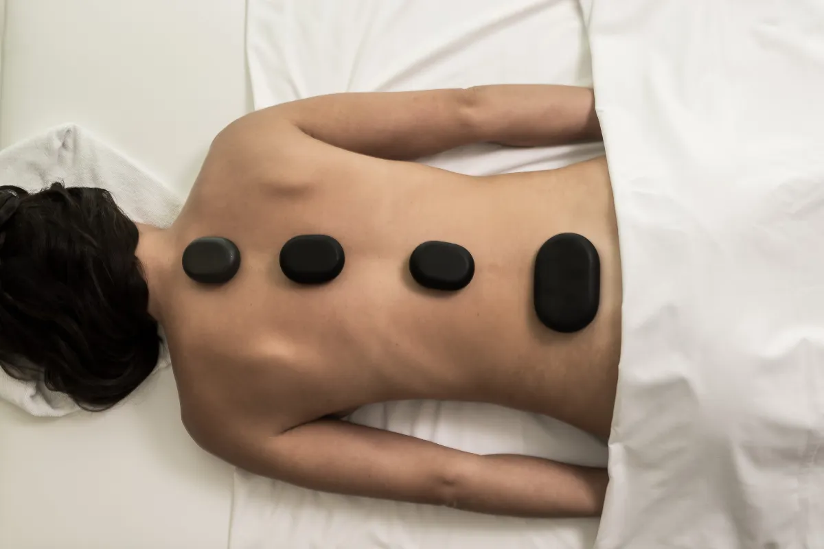 Piedras calientes sobre una espalda durante una sesión de masajes.