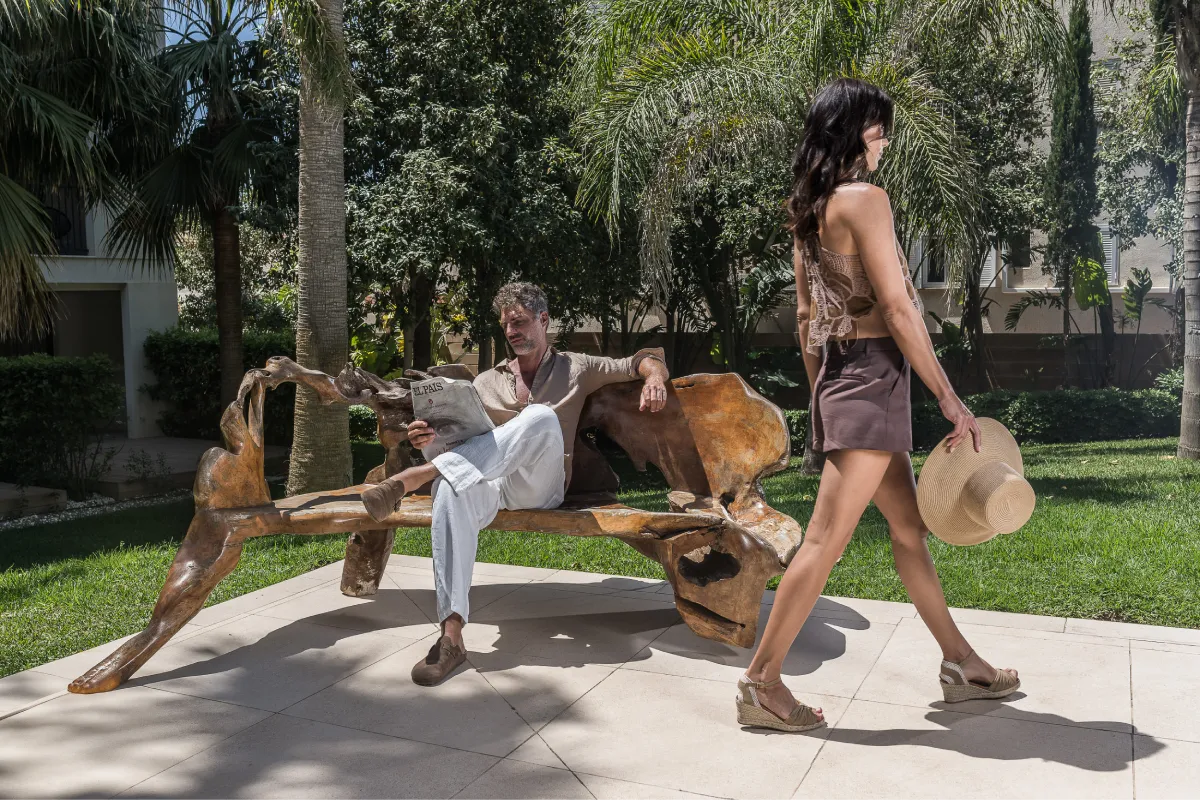Pareja bailando al aire libre en un día soleado.